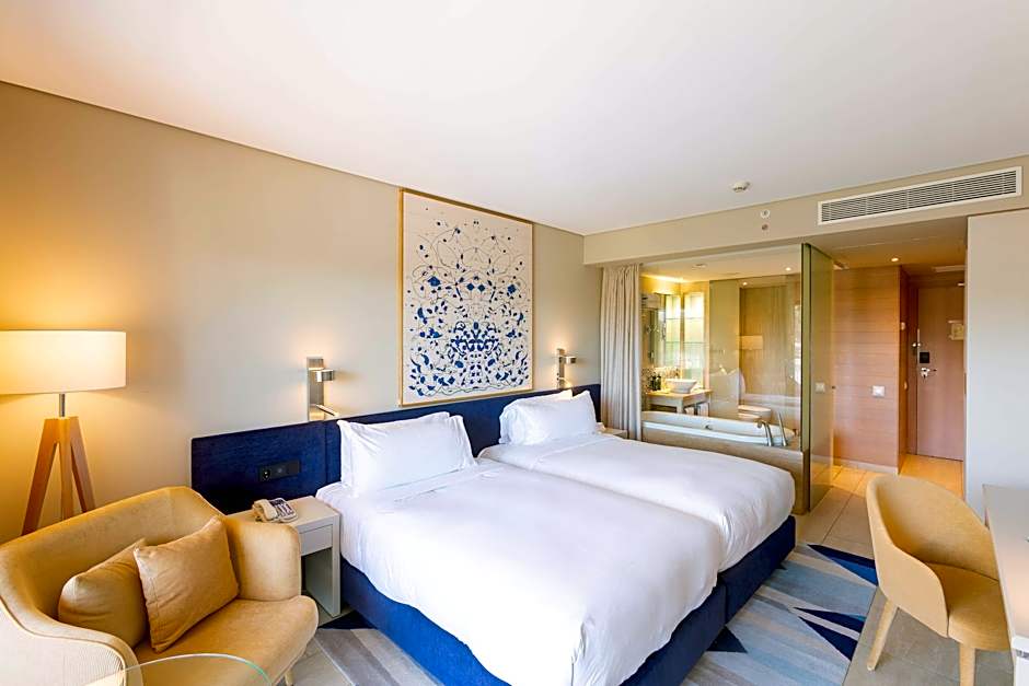 Deluxe Room with private balcony and flat-screen TV. The spacious room has twin beds and a marble open-plan bathroom with natural daylight.